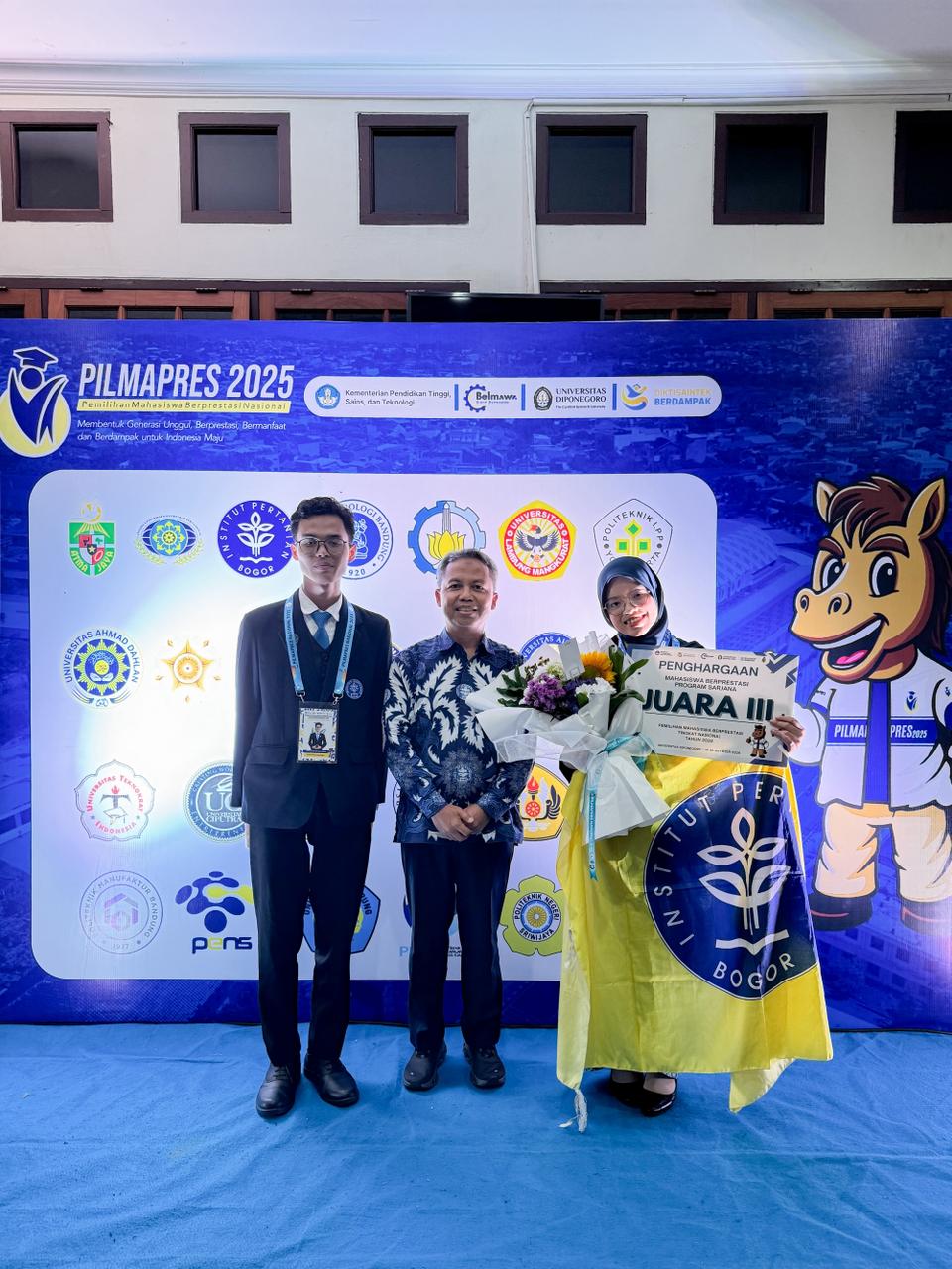 Kabar baik datang dari delegasi IPB berhasil meraih prestasi pada ajang Pemilihan Mahasiswa Berprestasi (Mawapres) Tingkat Nasional Tahun 2025 yang diselenggarakan di Universitas Diponegoro, Semarang, Jawa Barat pada 25-28 Oktober 2025. Capaian prestasi yang diraih adalah sebagai berikut: